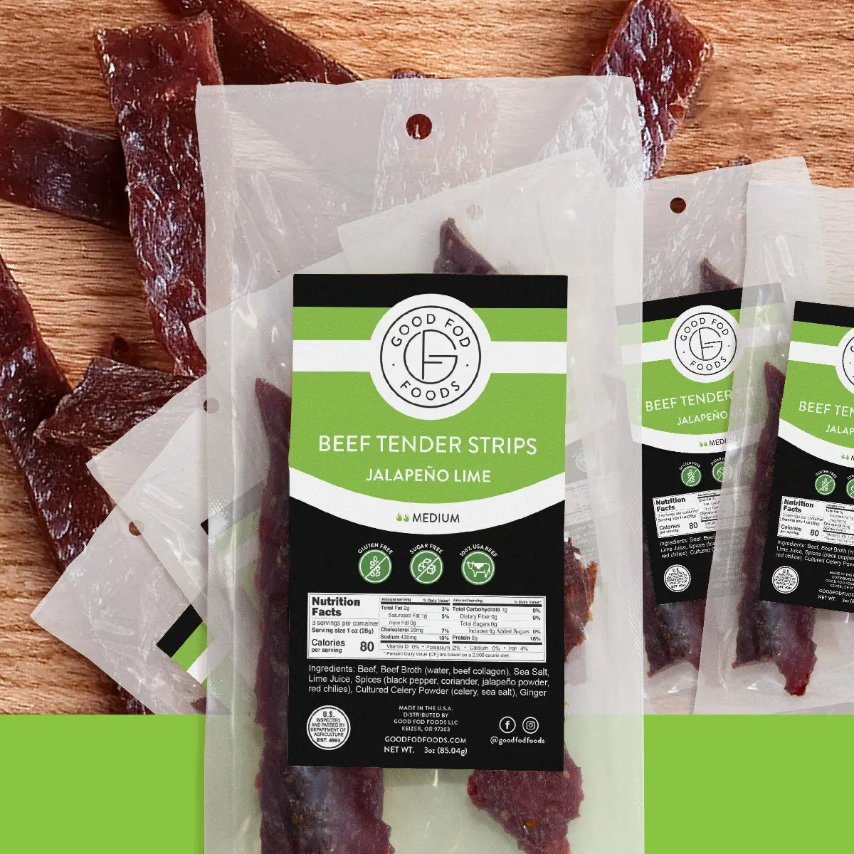 Turn up the flavor without overwhelming heat. These beef tender strips are Good Fod Food's flavor lover's special. Modeled after our jalapeño-lime beef sticks, they're just a little spicy with a hint of lime.